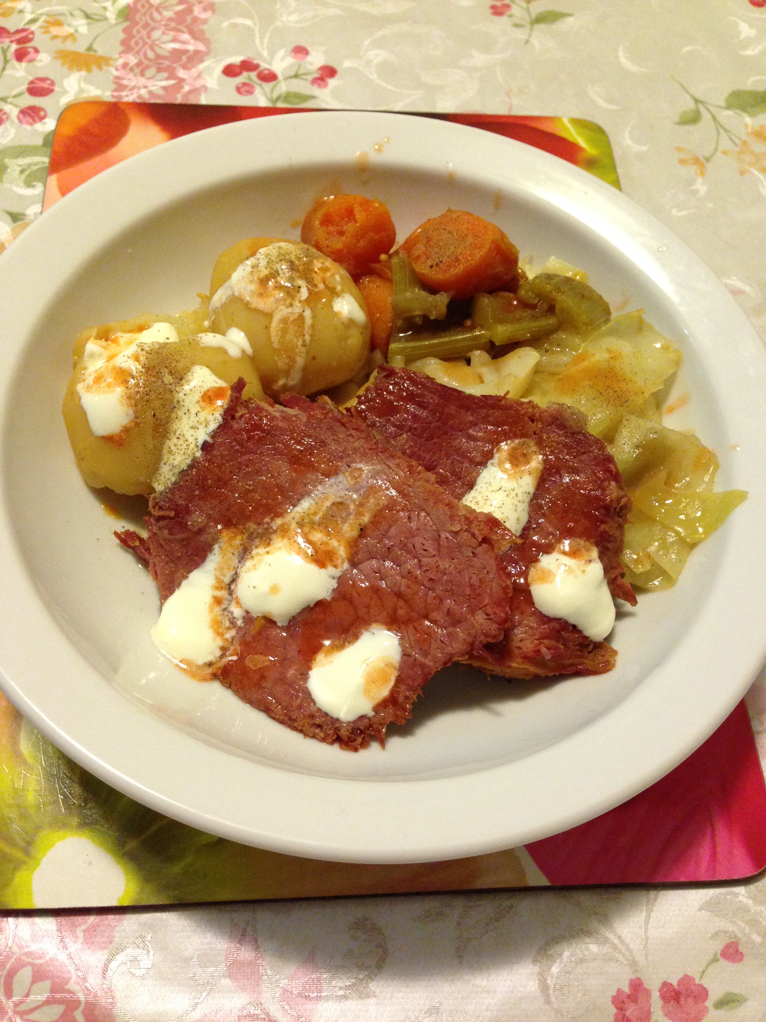 Carefully transfer corned beef to serving platter, let rest for 5 minutes. Slice beef, going against the grain, and taste seasoning. I like mine with a tiny bit of salt. Place 2 slices of corned beef in bowl with vegetables and dollop some whipped cream and chili oil. Enjoy!!!