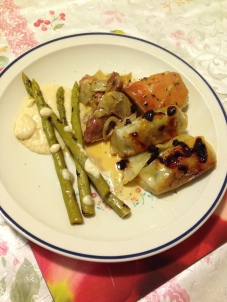 To serve: carve pork into thick slices and place 2 thick slices on serving plates. Add a spoonful of bean puree, 2 gyozas and some roasted asparagus. Drizzle with wine, herb sauce and season with salt and pepper.