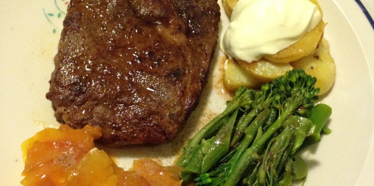 Bring out steaks to room temperature. Then heat a heavy-based pan and cook steaks for 4 mins each side, or until done to your liking. Meanwhile bring saucepan to boil and add broccolini and a pinch or two salt to boil until tender and cooked. Drain and season with salt and pepper; divide onto plates. Cut pineapple into bite size, divide into 4 plates and top with relish and put together with broccolini, steaks with sour cream potatoes baked. Enjoy with a glass of wine.