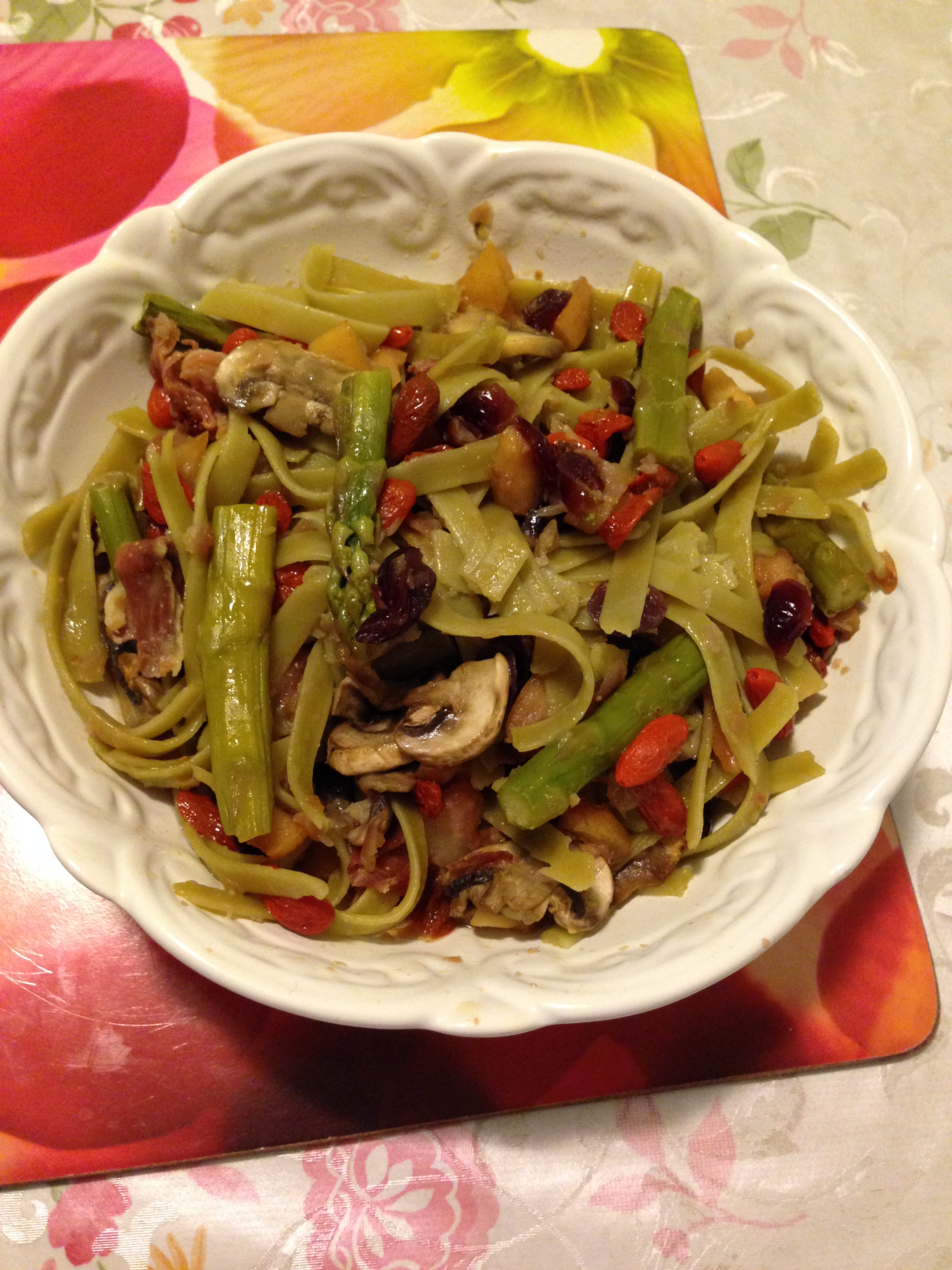 In a large pan, heat the olive oil; add apple and pear. Sauté till soft. Add the crushed garlic and sauté till it just starts to brown. Add the asparagus for about 3-4 minutes till the asparagus turns bright green. Add the mushrooms till the mushrooms starts to brown a bit not burn. Add red chili flakes, goji, cranberry and salt and stir well to combine.