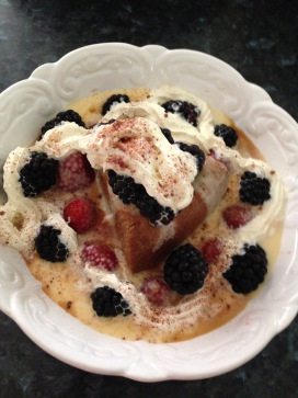 Mix well frangelico, vanilla and custard then place in fridge to cool. Meanwhile cut up a day old Pao de long cake into serving size; soak in espresso coffee then place in the dessert bowl with a layer or two vanilla custard on top of it and at the bottom, followed by whipped cream and decorate with strawberries and blackberries. Then sprinkle chocolate powder.