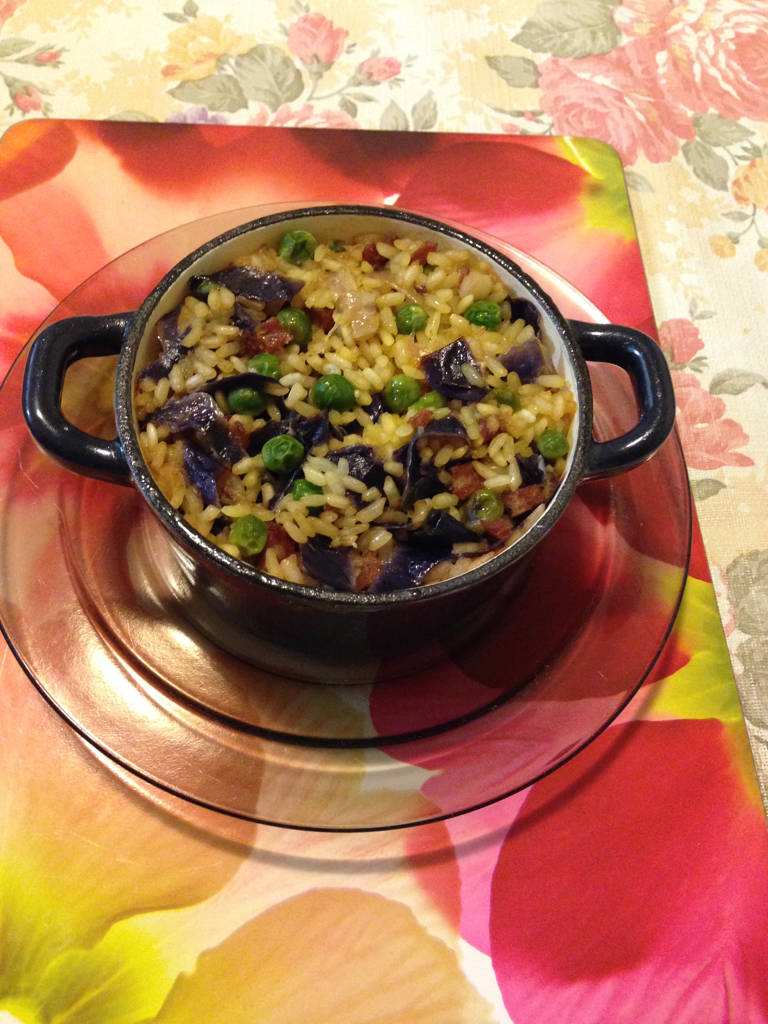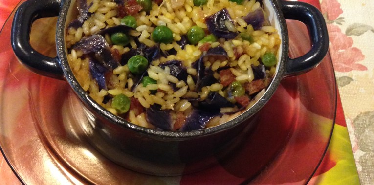 Place the saffron thread and salt in the hot boiling water once the kettle is boiled. In a pan put oil over med heat until oil is hot, add garlic, onion brown it and sweat it. Then add in the chorizo cooked for about 2 minutes. Then add the red cabbage and peas until it’s softened about 4-5 minutes.
