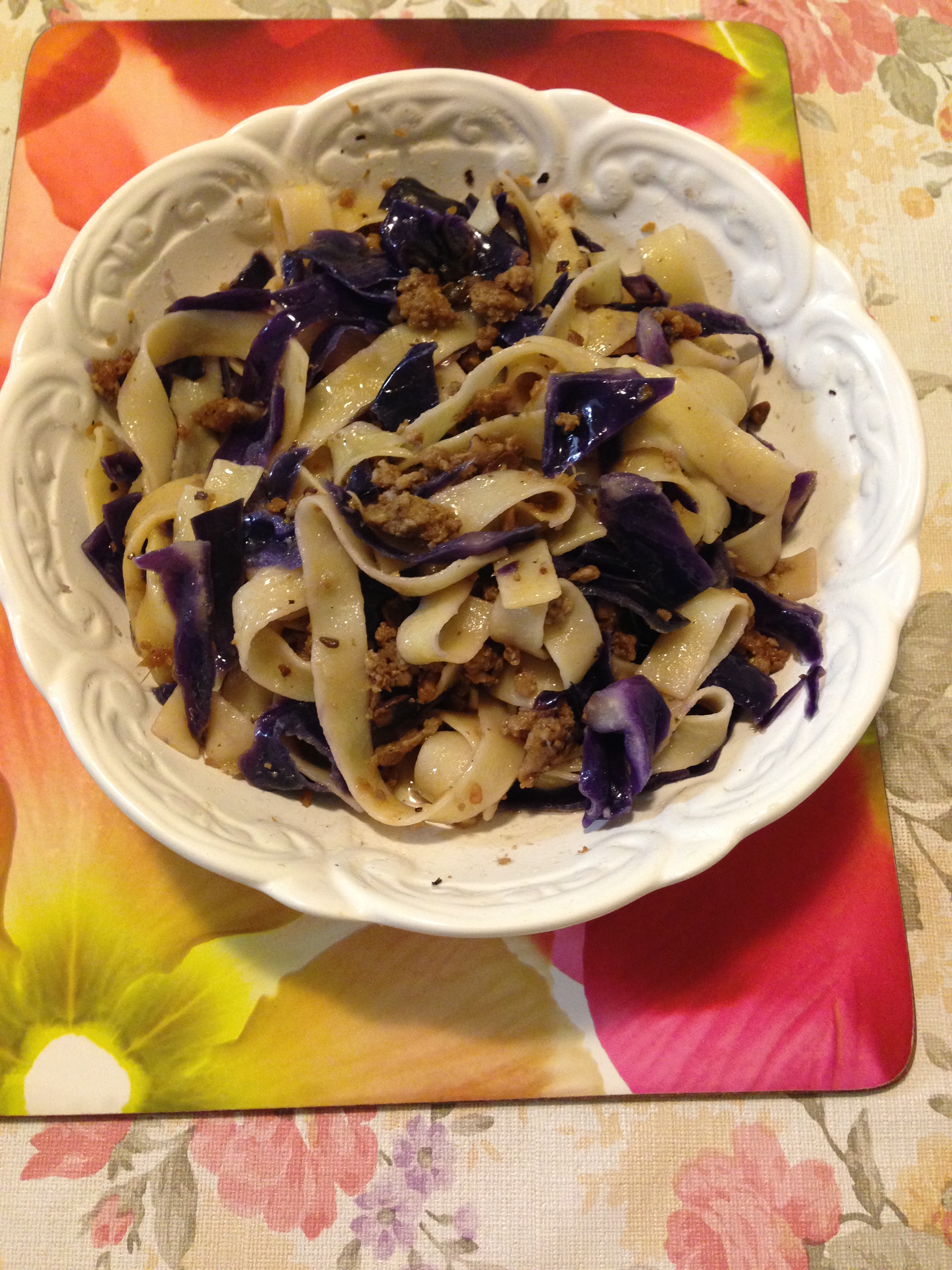 Here’s another fusion meal. Trying not to go out often due to coronavirus. My mom gave me some tau chee bak. I have tagliatelle and red cabbage, so I decided to add them together.