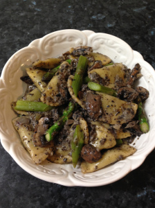 Melt the butter in a large wok over medium-high heat. Add asparagus, fry for 3 – 4 minutes. Then add the both mushrooms, onion, shallots, garlic, 1 Tsp salt, and 1/4 Tsp black pepper; cook 10 – 12 minutes or until liquid evaporates and mushrooms are tender, stirring occasionally.