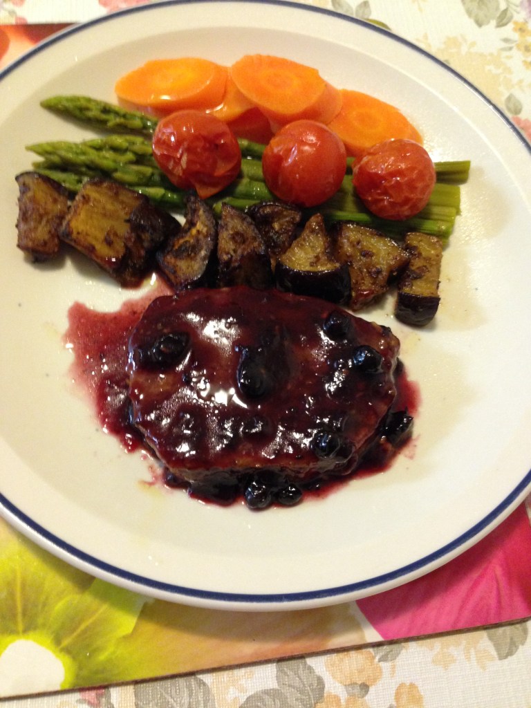 Brush the blackcurrant jam on rib eyes then roasts about 7 -10 minutes on one side. Reduce temperature to 180 degrees and turn over the other side and brush some more jam, continued roasting a further 10 -15 minutes or to your liking. For medium-rare temperatures about 180 degrees C. Set aside to rest 5 minutes; keep warm the rib eyes. Transfer rib eyes and vegetables to a platter and serve with red wine.
