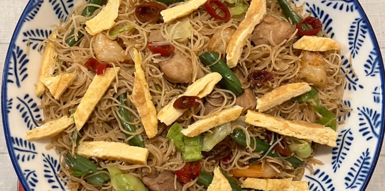 Next, add vermicelli and stir-toss for about 4 minutes or until the noodles turn soft and are not wet. Add cos lettuce and char siu, mix well for about 2 minutes until cooked and warmed up. Microwave the egg matchsticks for 1-2 minutes. Serve bee hoon with egg matchsticks and cut chili. Enjoy with a glass of red wine!!!