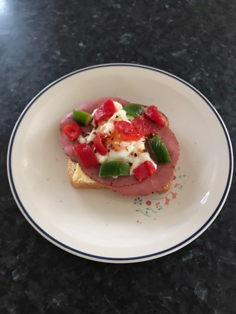 https://helenscchin.com/2016/09/23/poached-egg-capsicums-pepperoni-on-bread/