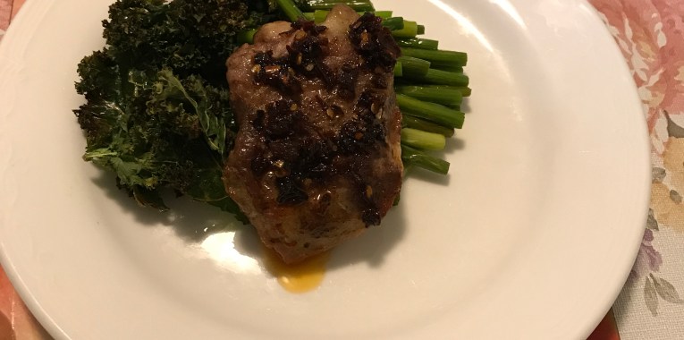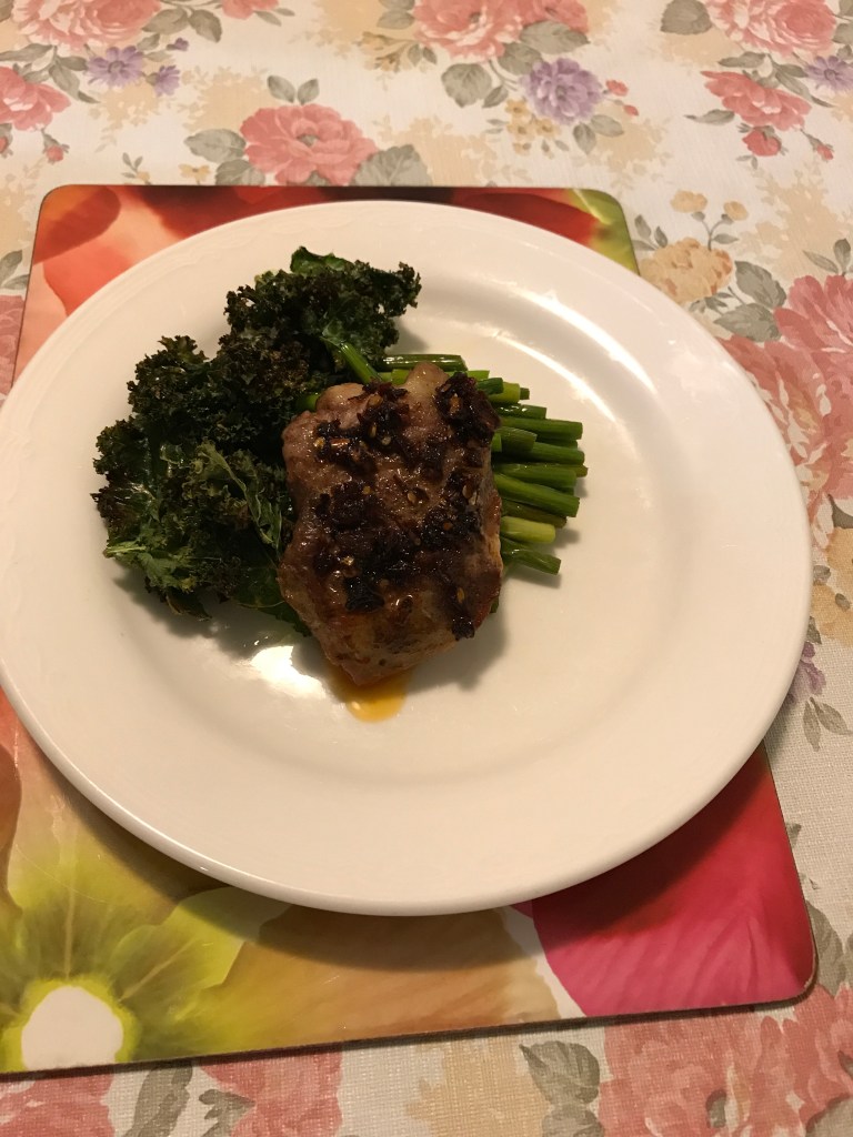Once time up, remove baking pan, toss Asian garlic sticks around the beef, and return to the oven for another 10 minutes. Time up, remove baking pan; add kale leaves, tossing them in lined baking pan drippings. Roast for a final 5-10 minutes until the kale is crispy, the garlic sticks are tender, and the beef fillets are cooked medium rare. When time up, remove beef fillets, tent with foil on another lined baking pan, and let it rest for 10–15 minutes. Switched off oven, leave door a jar with a wooden spoon, and leave vegetables in until ready to plate. I would put my plates into the still hot oven to warmed up plates. You don’t have too.