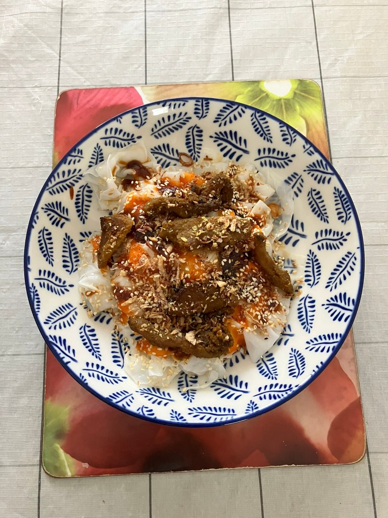 I haven’t had chee cheong fun in a while. I bought a packet to try with hoisin sauce, added my favourite chili sauce, Sriracha, leftover fried fish, and garnished it with white sesame seeds and fried shallots.