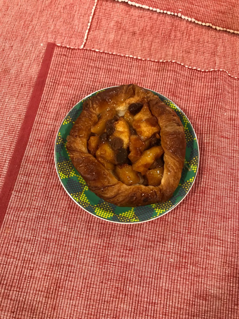My style galette are cooked apples pieces with raisins soaked in bourbon and using fig jam instead of caramel sauce as most recipes use them. Here’s pie cooking and cheat jammy puff pastry galette. Glad it turned out sweet, cute and delicious. Let’s cook!!!