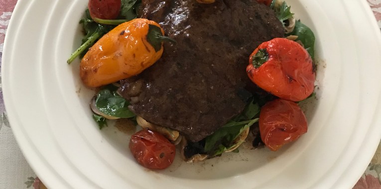 Warm up the remaining marinade in microwave. Meantime, place salads and mushrooms on 2 plates.  Then top with steaks. Garnish with cherries and capsicum around it. Drizzle the marinade over it and serve with Pinot Gris (Red wine) or any of your choice.