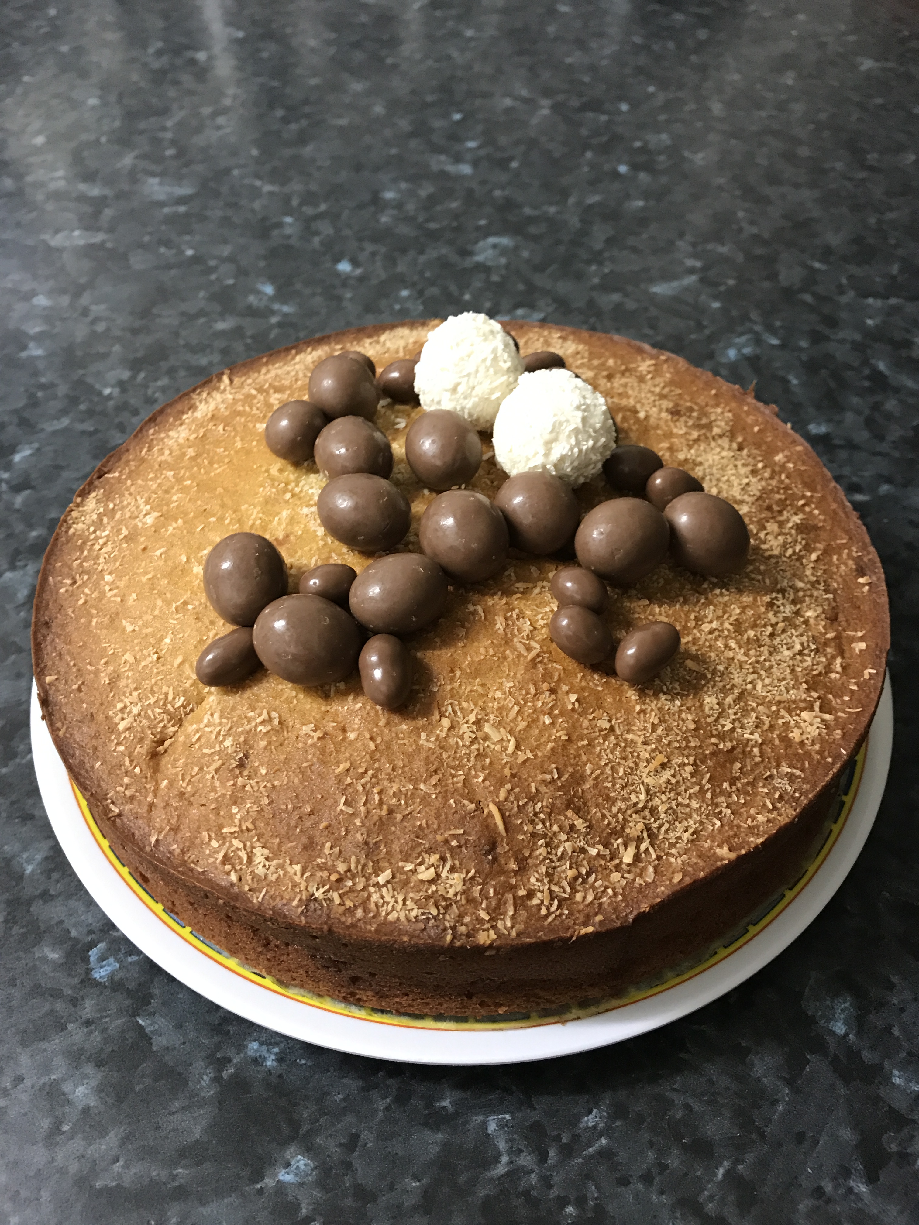 Spoon half batter into prepared pan and sprinkle chocolate sprinkles on top. Now add the remaining batter; sprinkle some desiccated coconut on top of smooth batter. Bake for 1 hour 20 minutes or until a skewer inserted into the centre comes out clean. Switch off oven and remove cake. Leave in the pan for 15 mins to cool on bench top before transferring to a plate. Once completely cool, store in airtight container until ready to eat. Serve with brewed coffee or English breakfast tea.