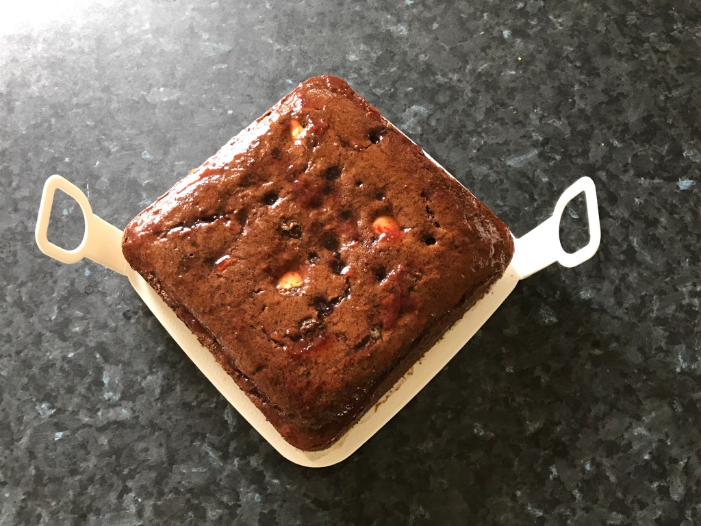 Pour into prepared tin. Gently press in dark chocolate alternate with white chocolate and blueberries. Bake for 60-65 minutes. Skewer comes out clean then cake is done.