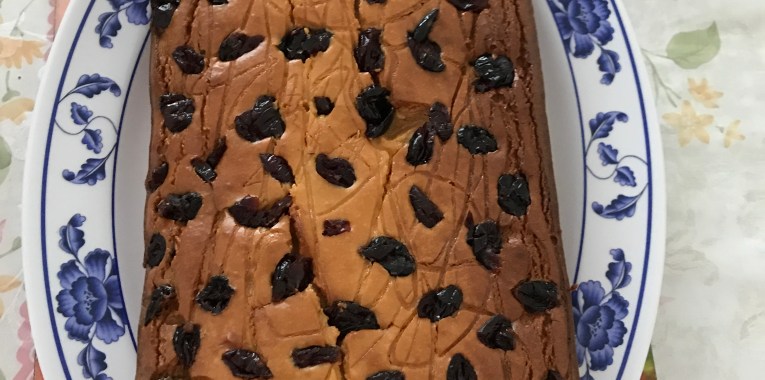 Pour batter into pan, then add the remaining 100 g craisins; gently press into batter. Give a couple of knocks on bench top. Bake for 45 minutes or until cooked through. Check with a skewer, if comes out clean then it’s done. Leave in oven for 25 minutes, switch off oven and close door.