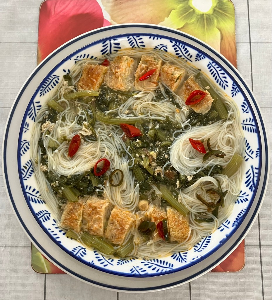 Bought choy sum, kin tok kin (Bean curd pork rolls), and garlic. My sister gave me fresh chili. I found a square piece of bee hoon in my pantry, so I’ll finish it off before getting a new packet.