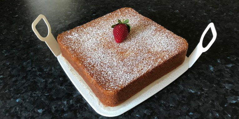 Place cake in fridge for 45 minutes. Then take out and dust icing sugar on top before putting in an airtight container and cover the container.