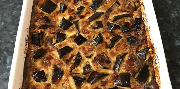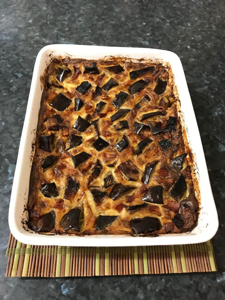 Spoon to a lightly greased baking dish and decorate with remaining eggplant pieces and bacon. Bake, halfway through rotate, until brown and slightly puffed, about 40- 45 minutes. Serve with a glass of white wine.