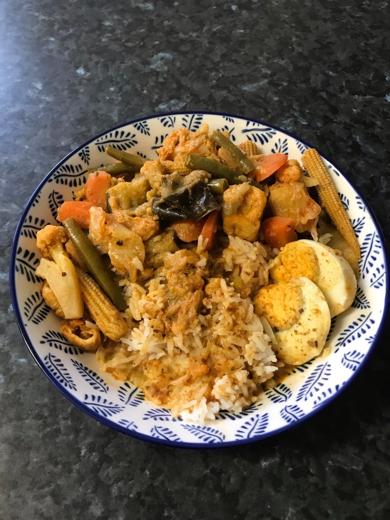 Note: You can add any vegetables of your choice: tomato, okra, peas, 3 colours capsicums, baby corns or chickpeas. You don’t have to add candle nuts, galangal and lemon grass as the packet would have all the ingredients ready. I added to try and see if there’s any different and for more flavour. You can serve with roti, chapati or noodles. I added one cup of vegetables stock for more gravy and as the tofu pok absorb the gravy when I left it overnight. You don’t have to add vegetables stock and eggs if you area eating on the day itself.