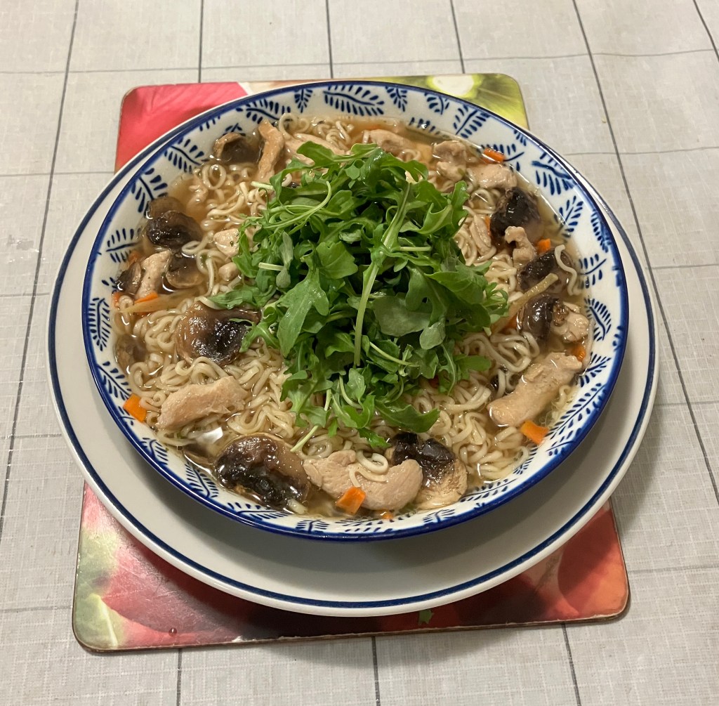 Went to Aldi to get toothpaste, ended up getting this instant Peking duck flavoured noodles soup. Have not had Peking duck for ages so, bought 10 carton bowls. Decided to add cooked chicken pieces: recipe written below, rocket leaves, and black fungus; bought two days ago to my noodles soup.