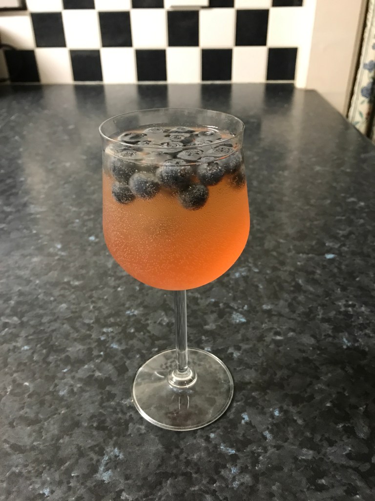 So, my mind said I have not done any drink. Let be Mr. Hyde the mad scientist, of course I am not making Frankenstein. I am making an alcohol refreshing drink. Found cosmopolitan in the pantry, in the fridge Prosecco, tropical juice and blueberries. Hooray!!! let put on mad food scientist hat.