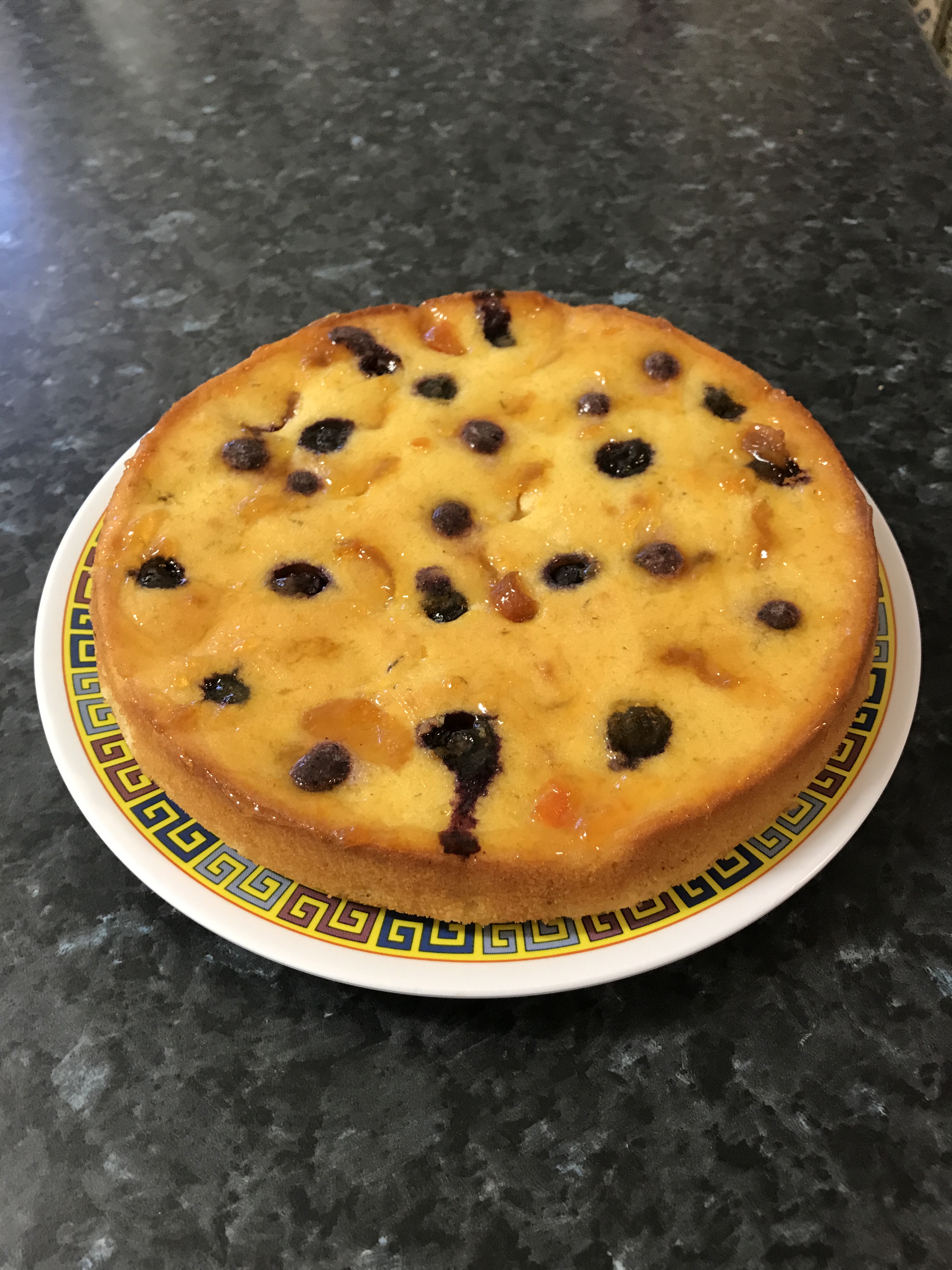 Once it has cool completely, spread apricot jam over the top. Serve it with more blueberries on the side and a cup of tea.