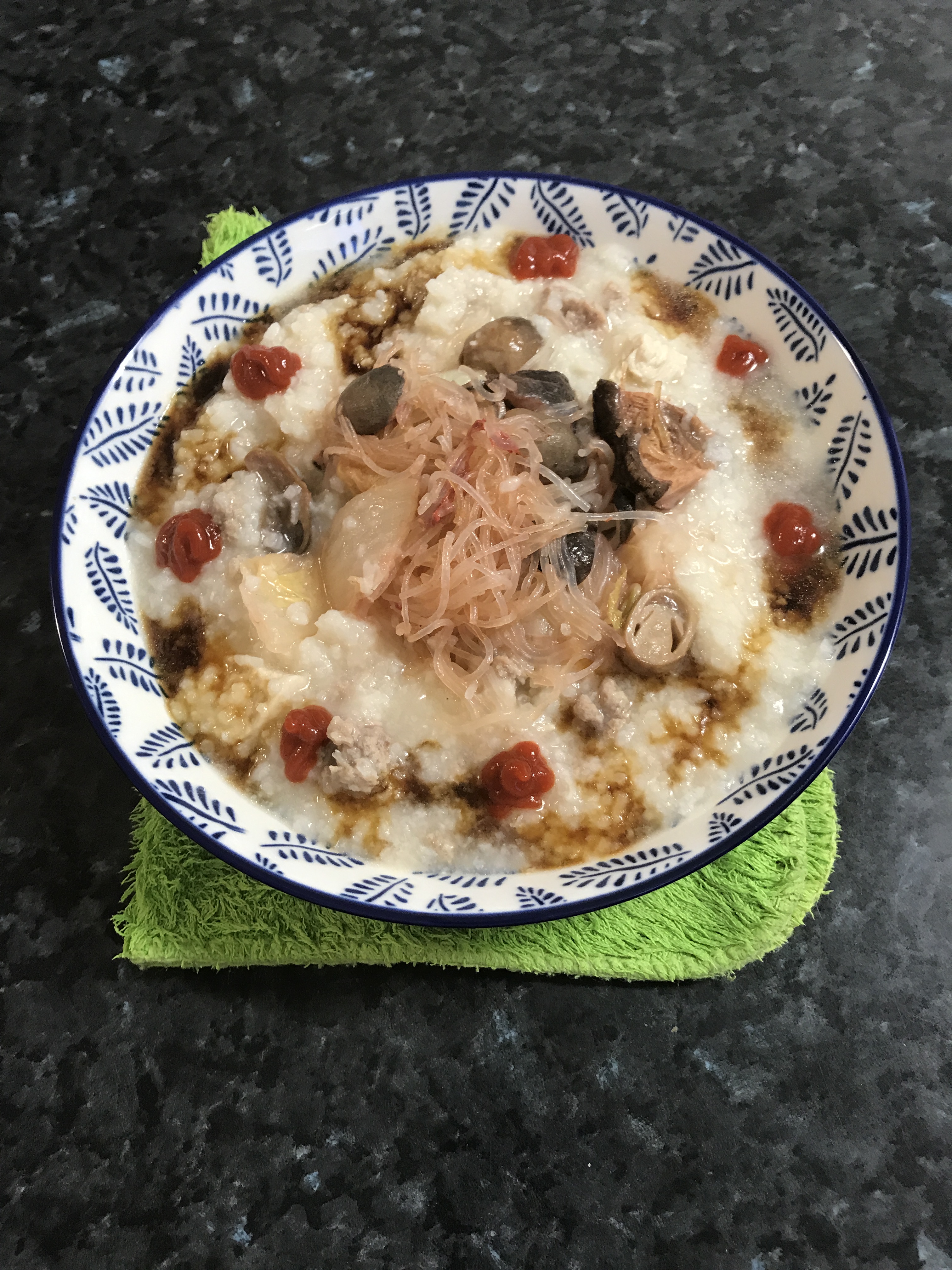 I remembered grandma congee ingredients also have salted duck eggs, century eggs, preserved olive leaves, spring onions, black mushrooms, dried shrimps, Chinese pickled vegetables, fish, fried oysters and scallops, fresh ginger sticks, fried shallots and poached chicken.