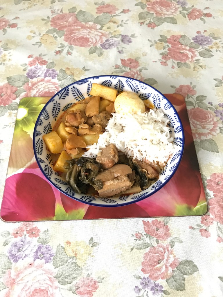Chicken curry is very popular and comfort food in Malaysia. The most important ingredients are coconut milk, spices, and curry leaves that give this curry a flavourful aromatic and thick texture. Chicken curry usually serve with roti Canai or paratha in my home back in Penang. Most Nyonya Malaysian chicken curry can be cooked with or without Potato. It can be served also with nasi kunyit: Malaysian coconut milk and turmeric-infused sticky rice which is when a baby is one month old. Here we serve with plain rice and a vegetable dish.