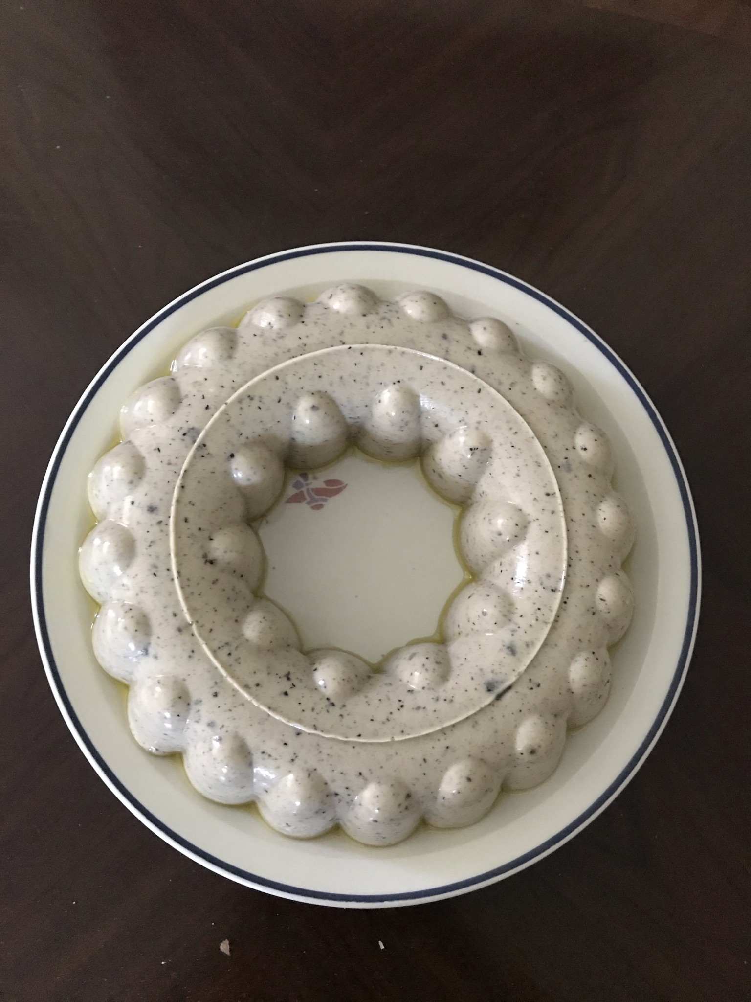 Squeezed out water of gelatine sheets and add in. Stir well. Now add gelatine powder mixture, a squirt of molasses and castor sugar. Stir until sugar dissolved. Turn off heat let pot cool slightly about 5-10 minutes. Meantime, greased the jelly mould with some oil. When it has cooled spoon cooled panna cotta onto mould. Leave it overnight or at least 4 hours to set. Enjoy!!!!