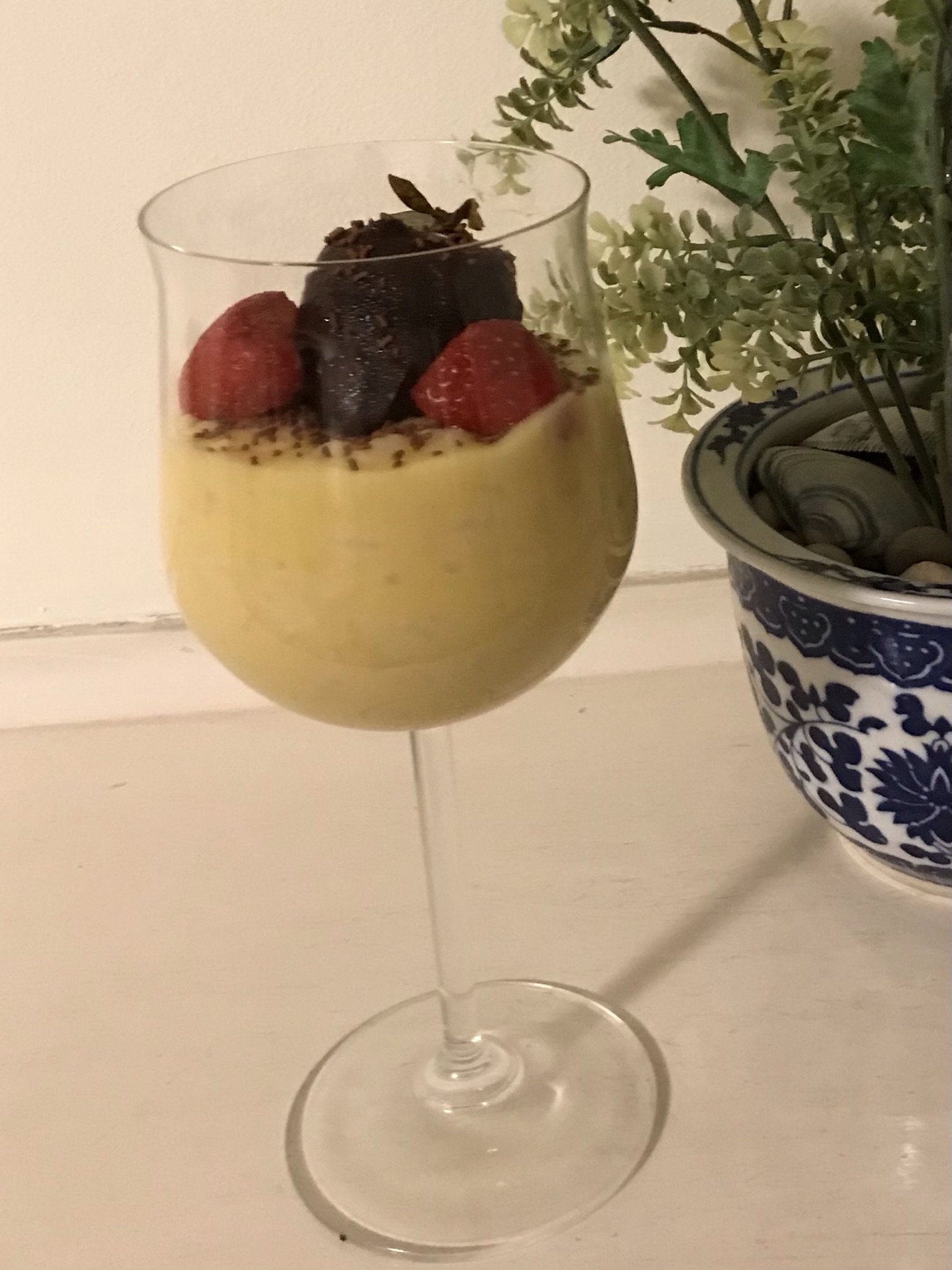 Remove from hob. Check the flavour and creaminess. Add 1 Tbs double cream if you like more creamy. Garnish with one strawberry dip in melted chocolate, cut one strawberry in half. Sprinkle chocolate sprinkles over. Enjoy!!!!