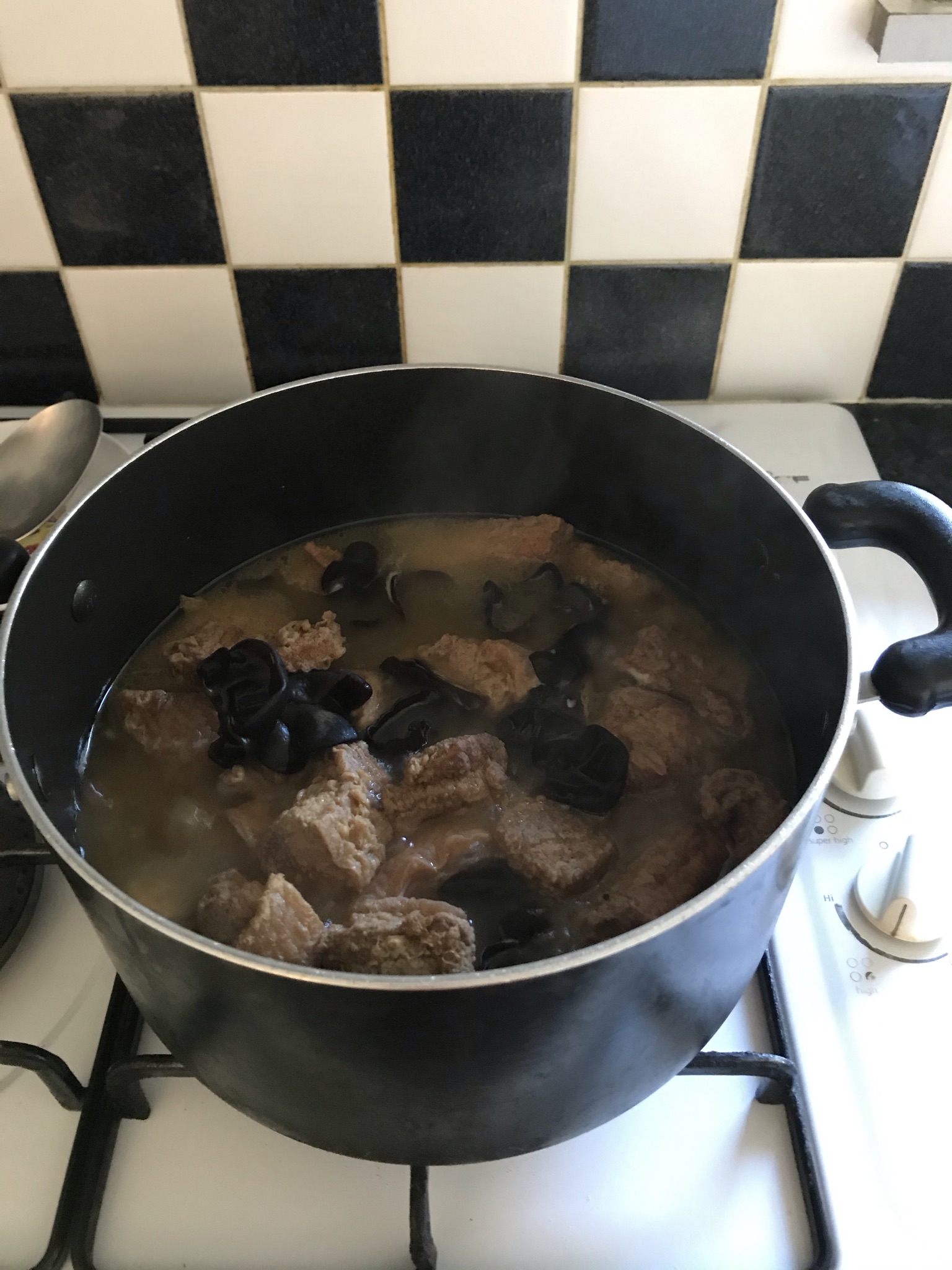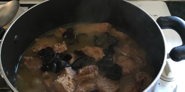Smash the individual garlic and add into pot. Now add black fungus in and strain the fungus water into the pot. Next add enough water to braise the pork until soft about 40-50 minutes. Check seasoning. Spoon char chee yoke onto a bowl and serve with rice, some vegetables as side dish. Serve with a glass of white wine. Enjoy!!!!