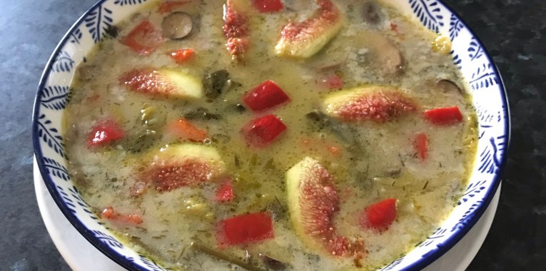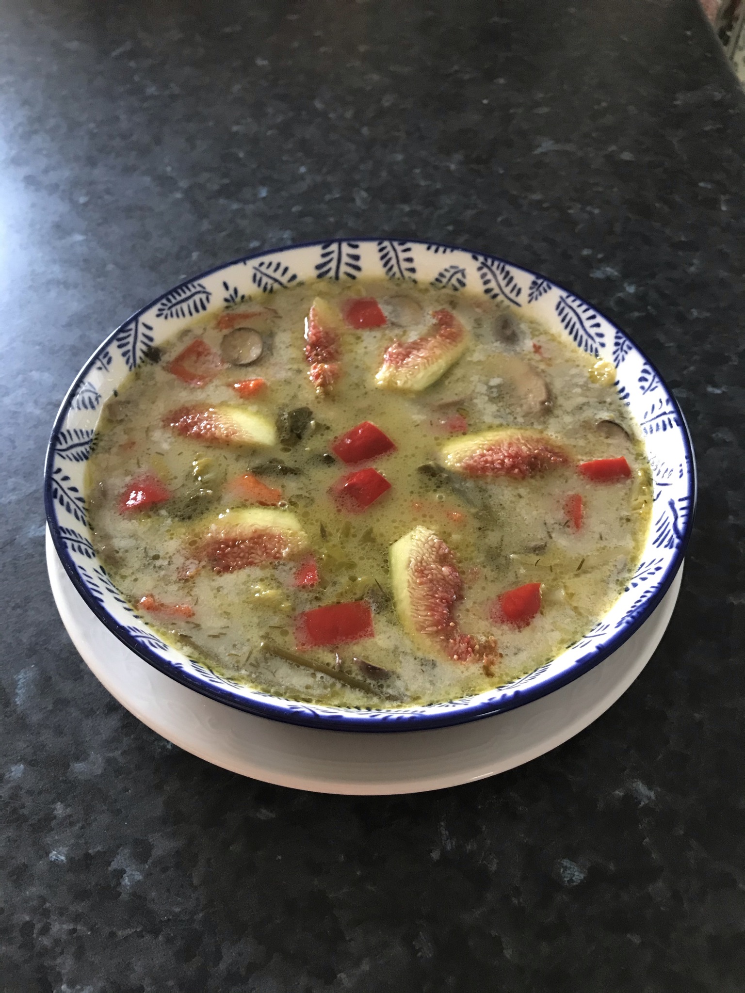 Today, this is my second time making it again as I don’t like wasting food. I have added two ingredients extra figs, and capsicums on top of one bunch leftover cos lettuces, mushrooms, use olive oil extra virgin, added 30 g of dill, white wine, spring onions and hot boiling water.
