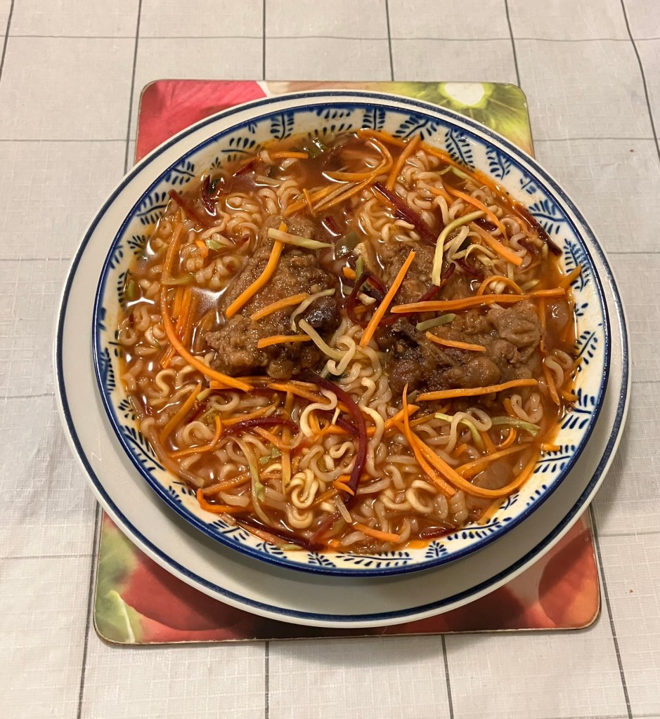 Put the kettle on. Once boiling, add to a bowl of Shin ram yun noodles with condiments and some char chee yoke, and sauce. Be careful, it will splatter as there are fats. Place the bowl in the microwave for 6 minutes until the noodles soften and cook. Then remove from the microwave. Once it’s done, add rainbow slaw to the cooked hot shin ram yun and char chee yoke. Serve with a glass of white wine. Enjoy!!!!!