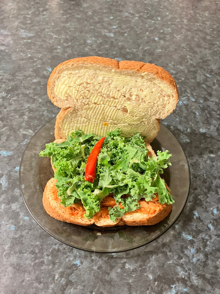 Once chili tuna is warmed up, spoon it onto the bottom slice of bread. Then place some curly lettuce and the one red chili on top. Next cover with the second buttered. Enjoy with a big mug of brewed coffee or tea!!!