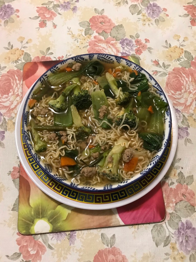 Simple lunch that is from leftovers and packet noodle. I use hot boiling water from kettle and microwave the noodle with the condiments and added minced pork green beans, carrots, broccoli, and buk choy.