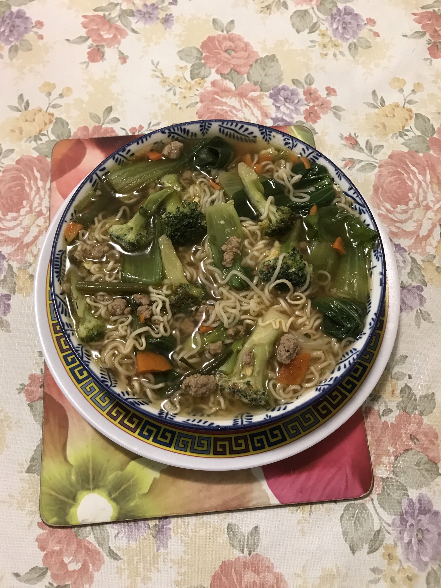 Simple lunch that is from leftovers and packet noodle. I use hot boiling water from kettle and microwave the noodle with the condiments and added minced pork green beans, carrots, broccoli, and buk choy.