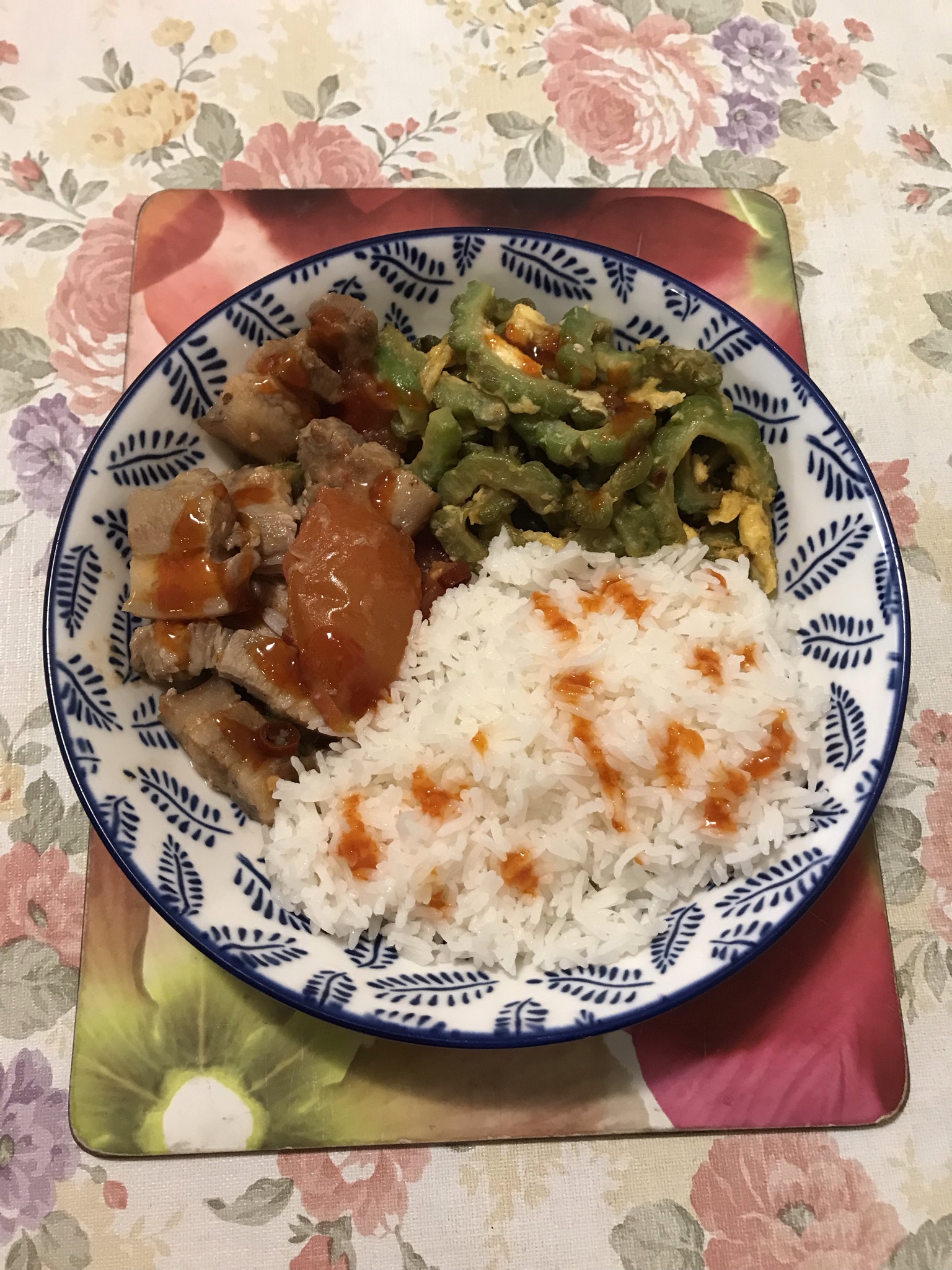Heat leftover cincalok pork in microwave if you have leftover for about 4-5 minutes. Pour the beaten egg over bitter gourd. Season with salt and pepper. When eggs start to cook, break it up and stir. Now stirring and flipping until bitter gourd egg are cooked about 4-6 minutes. Spoon to bowl and serve with cincalok pork and rice. Enjoy with a glass of red wine. I have added some chili sauce on my rice.