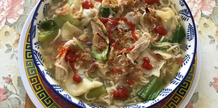 Another creative lunch noodle that is simple and quick to cook. Using my last leftover chicken pieces and prawns’ dumplings from Costco. Bought new fresh bok choy. Today, I am adding chili sauce as I crave for chili sauce.