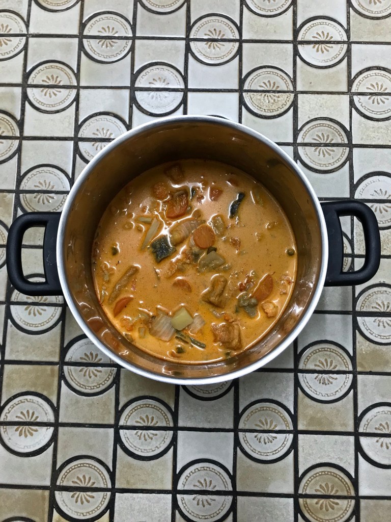 Note: You don’t have to simmer for so long, just 3-4 minutes will do. I simmer it longer as my father can’t eat the vegetables if it’s too hard. You can add any vegetables of your choice: okra, pineapples, peas, 3 colours capsicums, baby corns or chickpeas.