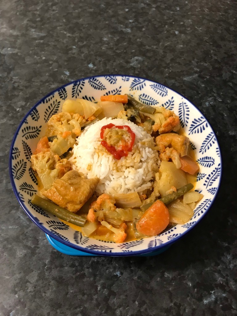 This time my ingredients are potato, fried tofu, carrot, eggplant, green beans and cabbage. Again, this Malaysia Traditional Specialties does not look red but creamy mustard colour. The curry is delicious, sweet tangy and creamy to my liking. Though I have to say it’s not spicy enough for me. Could not find the chili paste. If I had the chili paste it would be spicy enough to my taste bud.