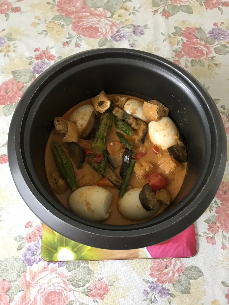 This time my ingredients are fried tofu, hardboiled eggs, carrots, eggplant, green beans and tomatoes. This Malaysia Traditional Specialties does not look red but creamy mustard colour. Though I have to say it’s not spicy enough for me. Could not find the chili paste. If I had the chili paste it would be spicy enough for my taste bud.