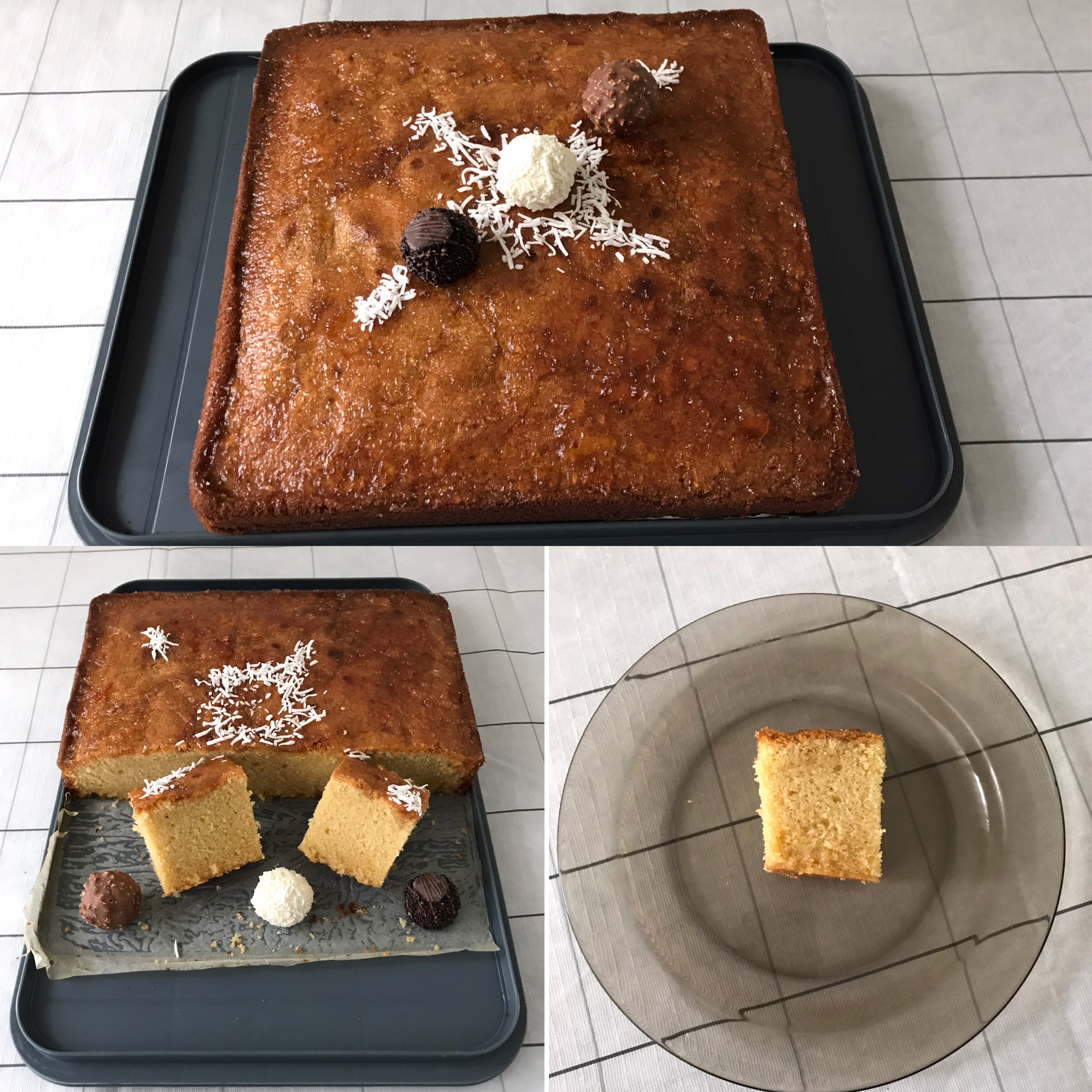 When it had cool completely spread marmalade jam on top. Then garnish with 3 different Ferrero chocolate and sprinkle some shredded coconut to make a design.