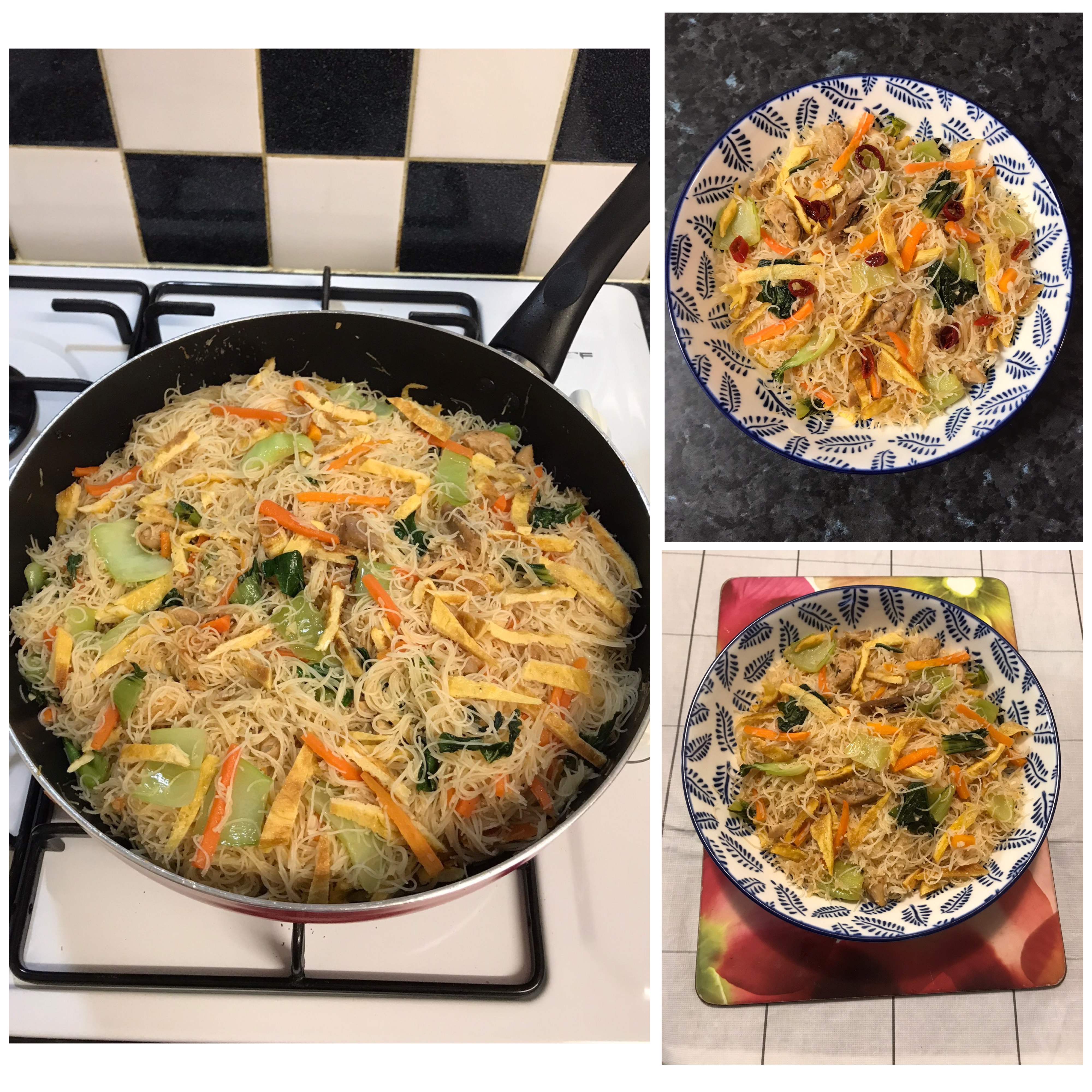 For a change, I am just using vermicelli noodles with diced chicken and vegetables. Addition for flavour I have added tom yum paste and garnish with egg rolls. My fried bee hoon is light and refreshing and it’s all-in-one pan dish that is flavourful spicy, colourful, healthy, and delicious. It sure is well worth the attempt!!!!! Let’s cook!!!!