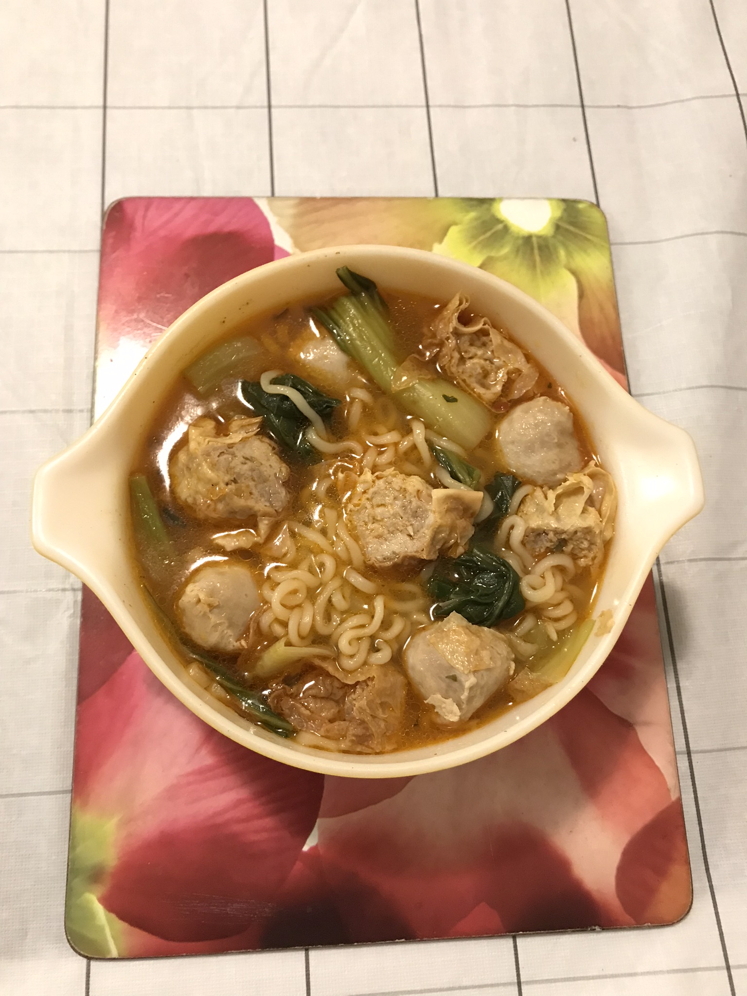 Put kettle on. Open the noodle packet and empty it into a bowl with its condiment and add pork balls. When kettle water is boil, pour into the prepared bowl. Microwave for 3 minutes, then add in ready cooked kin tok kin with some bok choy. Microwave again further 3-4 minutes.