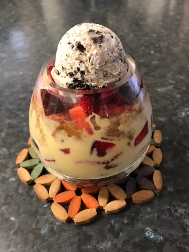 Followed by some strawberries and plums, then pour the custard on top. Repeat with another layer of cake, the fruits mixture with caramelised syrup on top. Then the remaining strawberries and plums. Refrigerate for about 30 minutes or 1 hour. Just before serving scoop a scoop of ice cream over the top. Serve immediately. Enjoy!!!