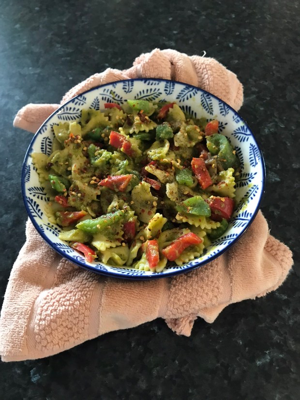 Green vegetables “such as broccoli, kiwis, cabbage, kale, Brussel sprouts, green bell peppers, collards, romaine, and spinach are mainly rich in vitamin C.” Today, I thought of making pesto and I don’t have basil, and pine nuts but have leftovers asparagus, green capsicum, cucumber, green capers, jalapeno, bow pasta and vegetable stock. Best use it before it turns rot.