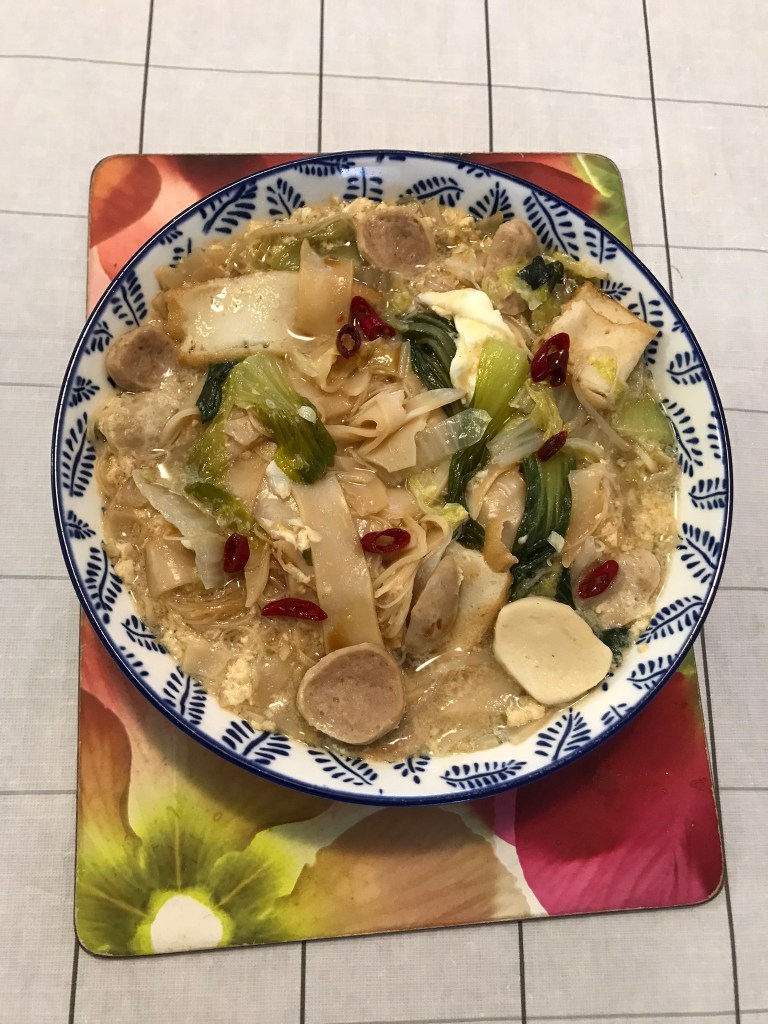 Today, I use bought chicken stock, no chicken and seafood just fish cake, fish and pork balls and bok choy and napa cabbage. My meal is broken bit egg sauce as I wanted something different from the usual hor fun as many people had made them. I have added cut chili as I got to have chili. Let’s cook!!!!
