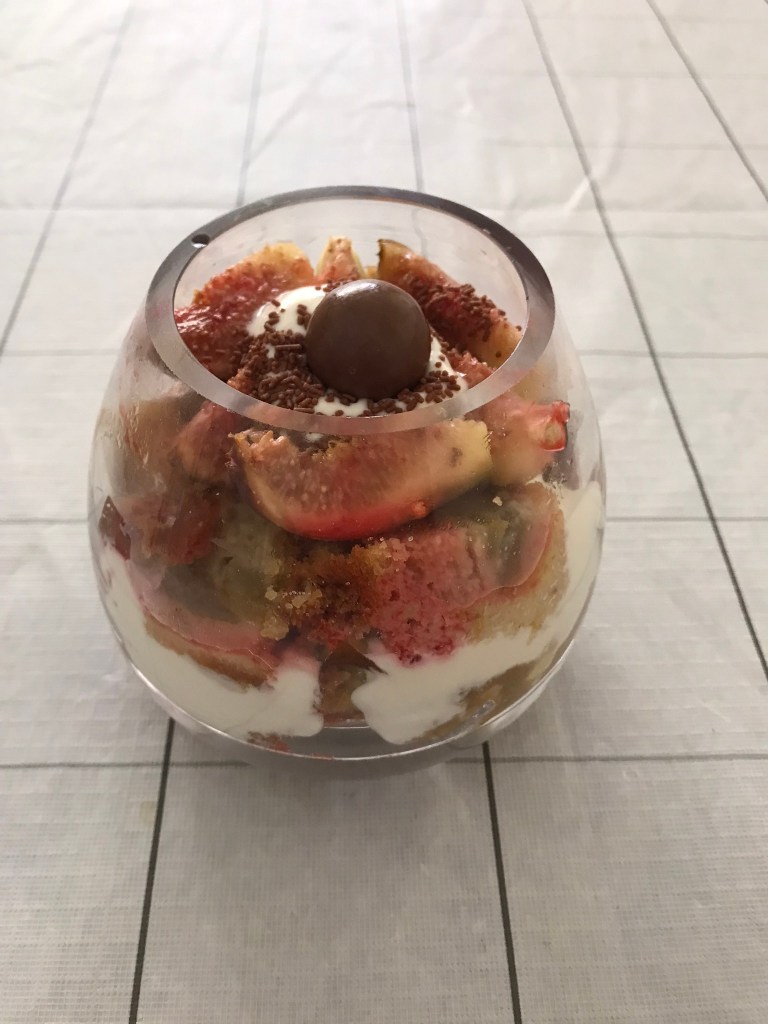 Place some buttered cake cubes into the glass, drizzle some rum over it. Spoon some sour cream over the cake. Next some fig wedges, drizzle rum over followed with some more buttered cake cubes in the centre. Then more fig wedges on top. Drizzle the remaining rum and cinnamon over. Spoon a dollop of sour cream, sprinkles chocolate sprinkles on top and place a chocolate dome on top. Enjoy!!!!