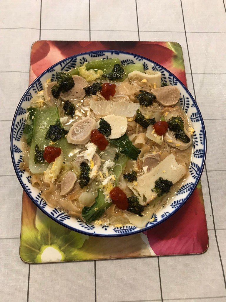 Heat up 2 Tbs oil in the wok and fry garlic until golden brown. Next add cabbage leaves, and bok choy; stir fry for about 5-7 minutes until vegetables are soft. Next add hor fun and vermicelli stir toss for about 6 minutes or until both turn soft and not wet. Then add fish balls, fish cakes, and pork balls stir to mix well for about 5-8 minutes.