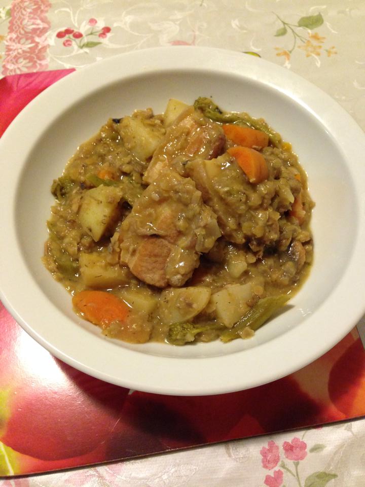 Heat mustard herring in a deep pot. Add shallots and stir for 1 minute. Add bacon, stir well, then add boiled lentils, and broccolini. Cover with stock, and wine, add the remaining 3 garlic and bouquet garni and simmer until the lentils are soft for about 20 minutes. Then add in pork pieces, carrots, and potatoes and cook further 15 minutes. Stir in cream and butter to thicken a bit for about 5 minutes. Serve hot with bread and a glass of white wine. Enjoy!!!!