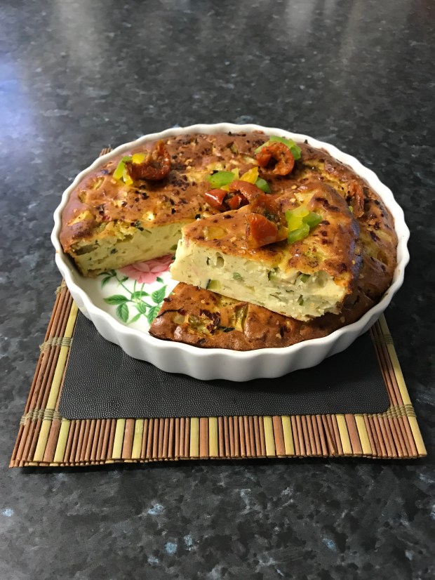 Bake for 40-45 minutes or until firm and golden brown. Cool in dish 15 minutes before garnish with sundried tomatoes and capsicums. Then slice into wedges and serve with simple salad and a glass of white wine. Enjoy!!!!!